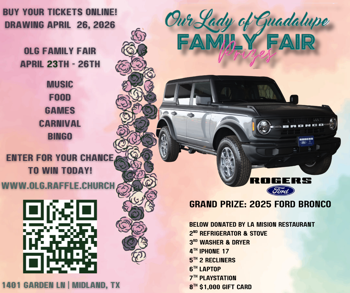Join us in supporting Our Lady of Guadalupe Catholic Church at this year’s Family Fair Raffle!
